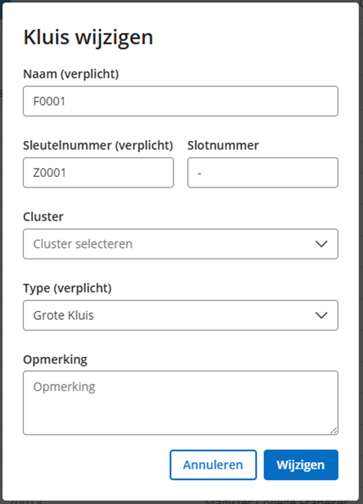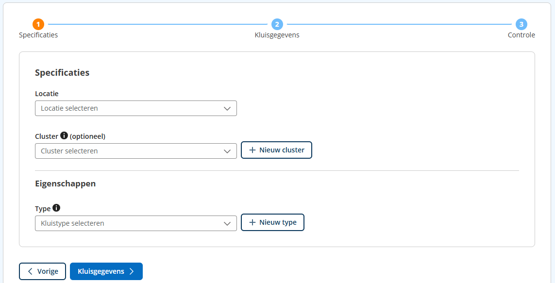 Vul de specificaties in. De locatie en het kluistype zijn verplichte velden. Er worden alleen locaties getoond waar de gebruiker rechten voor heeft.