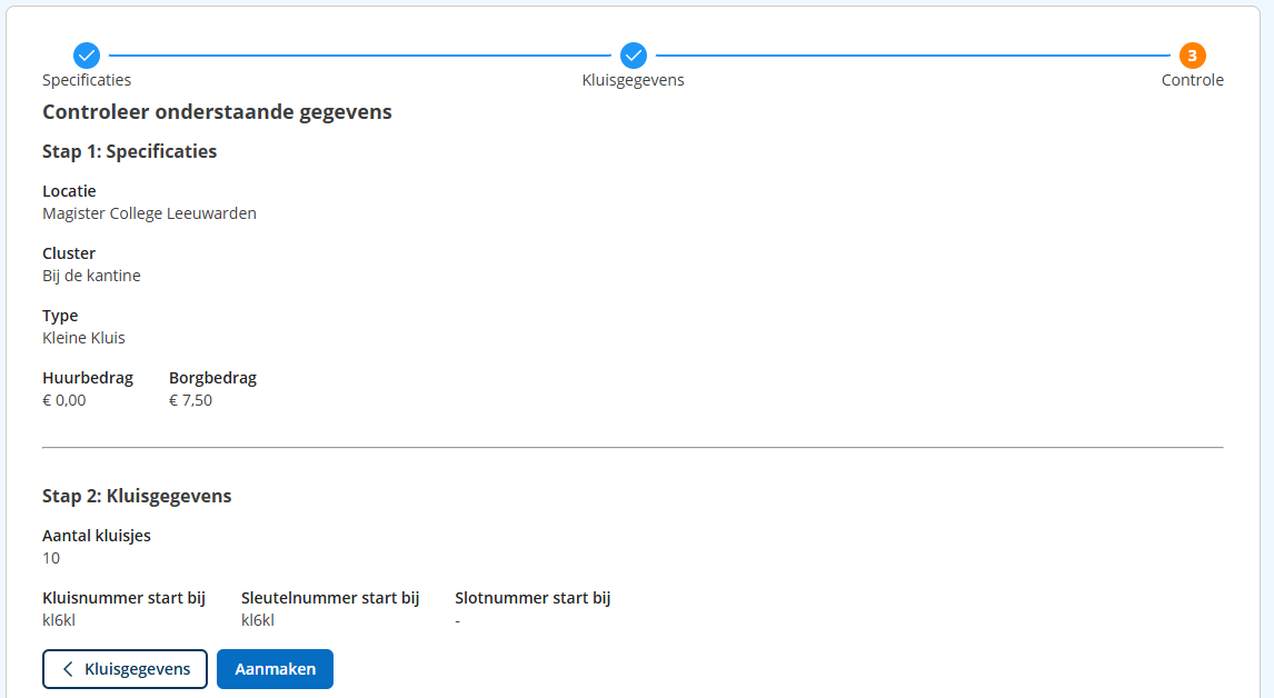 Klik op de knop ‘Aanmaken’ om de kluisjes aan te maken volgens de opgegeven specificaties.