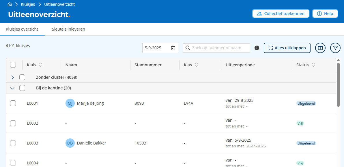 De overzichtspagina is de centrale plaats waar alle kluisjes en de uitleenstatus te vinden zijn. Ook is dit de pagina waar kluisjes kunnen worden toegekend, de uitleenperiode kan worden gewijzigd of beëindigd en kluisjes kunnen worden omgewisseld.