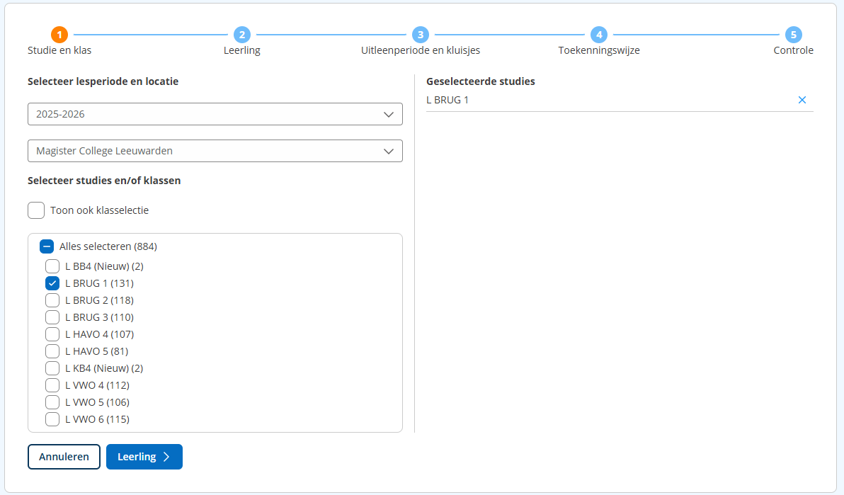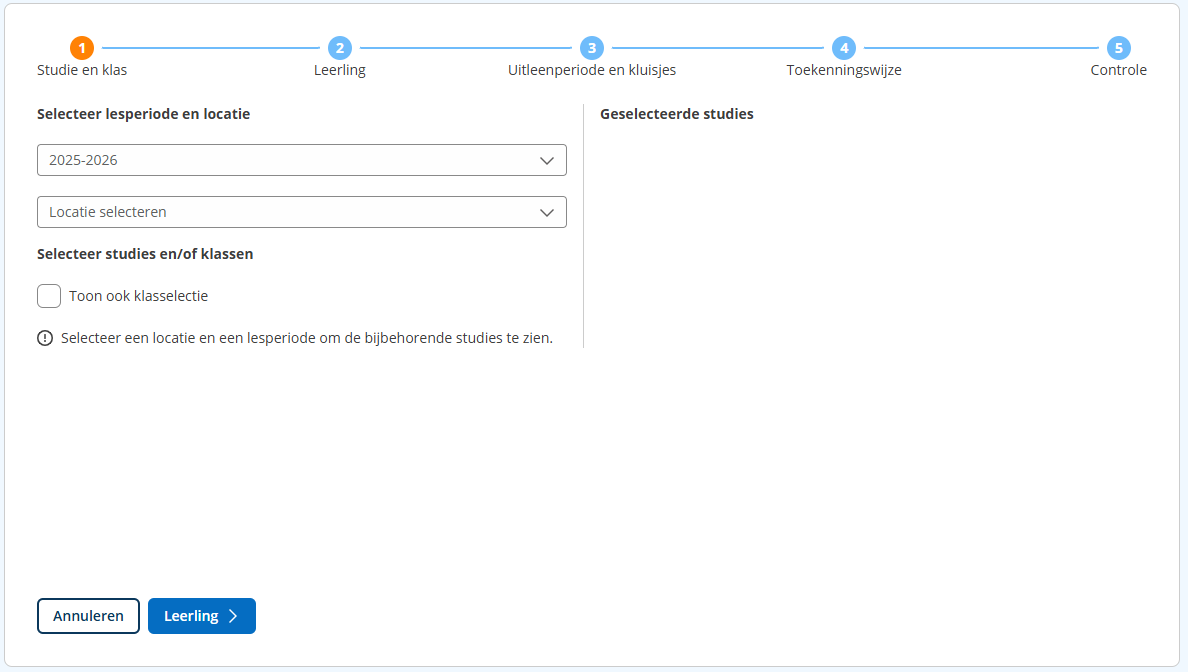 Na de selectie van een locatie verschijnen de studies van die locatie. Selecteer de studies van de leerlingen die een kluisje moeten krijgen.