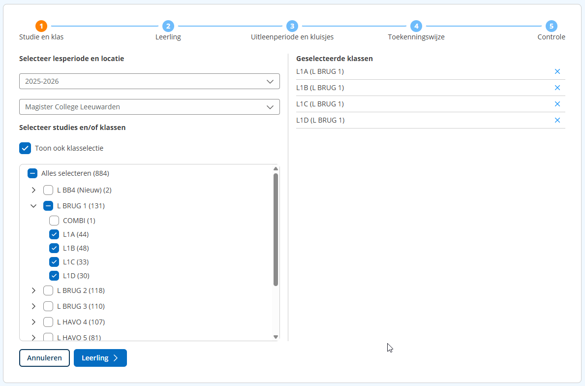 Gebruik de optie ‘Toon ook klasselectie’ om per studie de klassen te tonen en te kunnen selecteren.