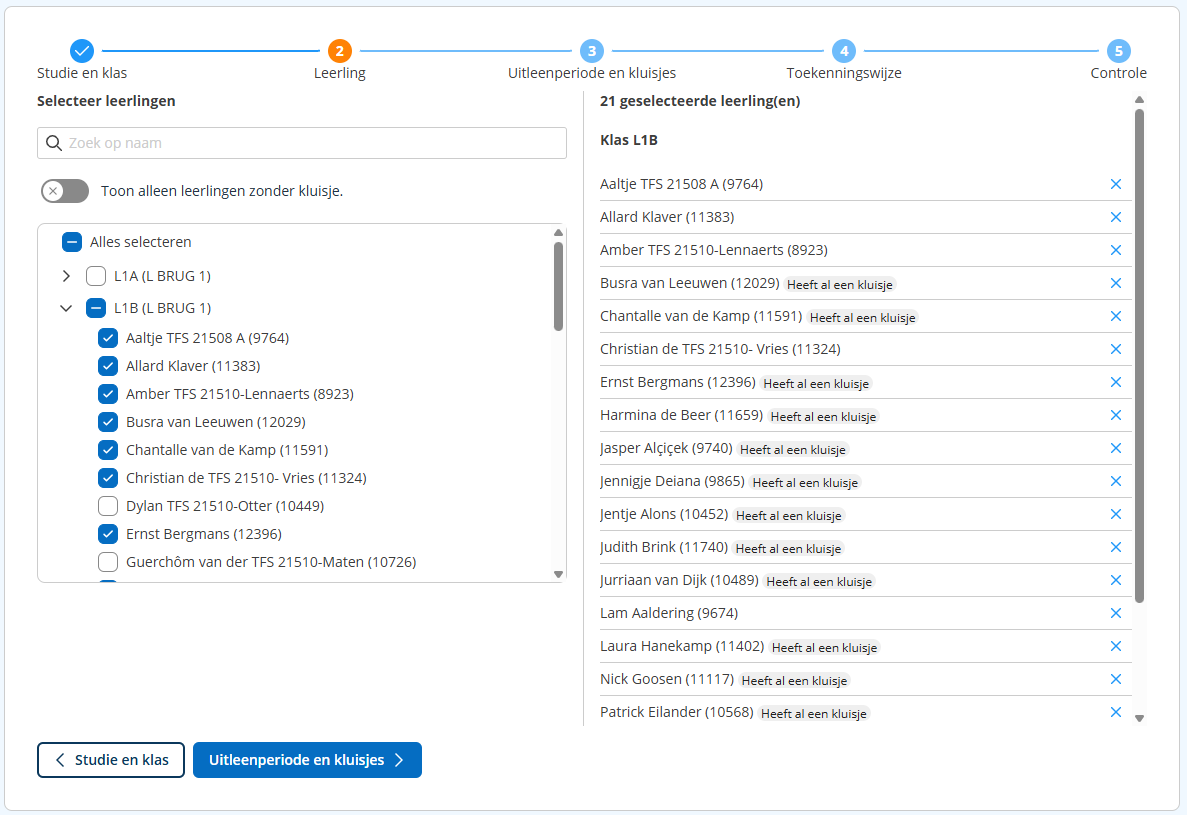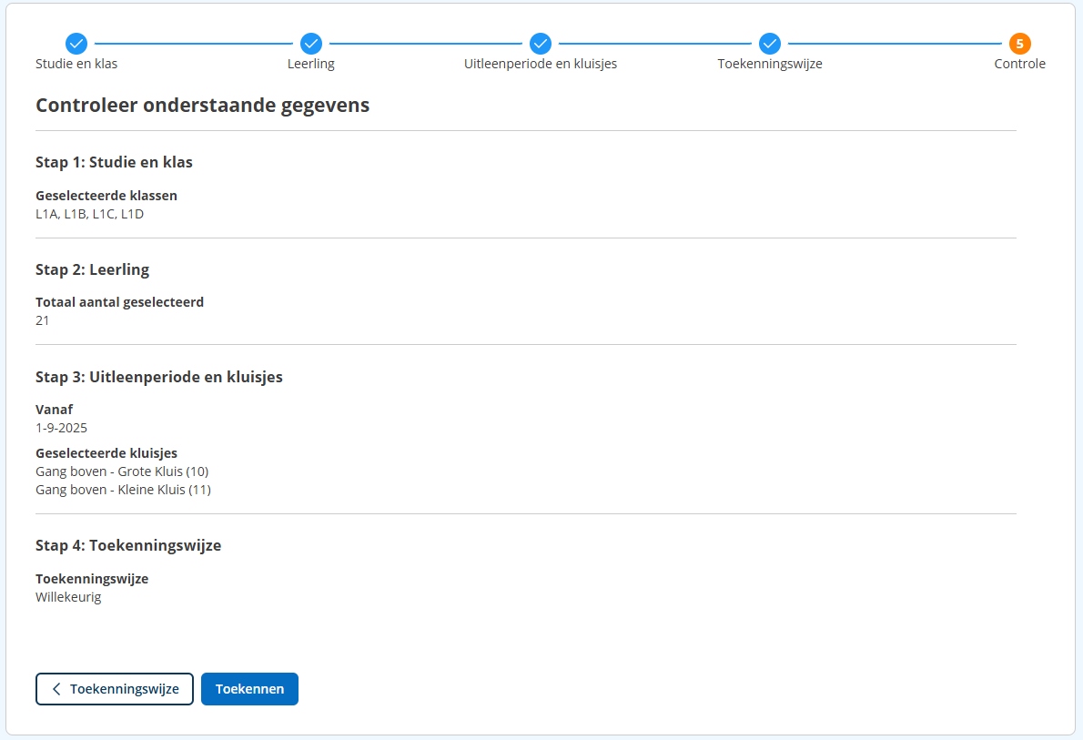Controleer de gegevens en gebruik de knop ‘Toekennen’ onderin om de kluisjes toe te kennen aan de geselecteerde leerlingen.