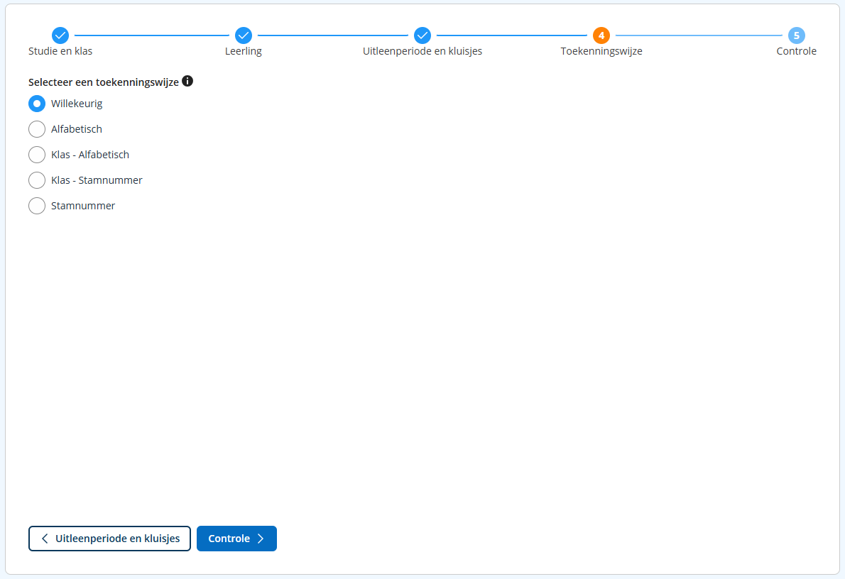 Geef aan op welke wijze de kluisjes moeten worden toegekend. Bijvoorbeeld alfabetisch op de naam van de leerling of het stamnummer.