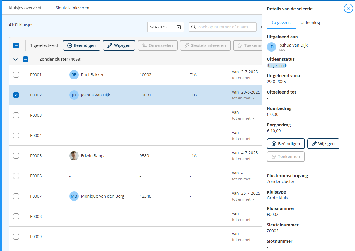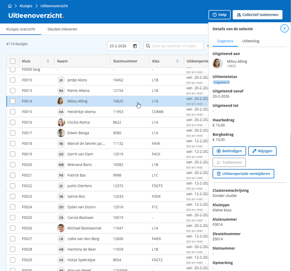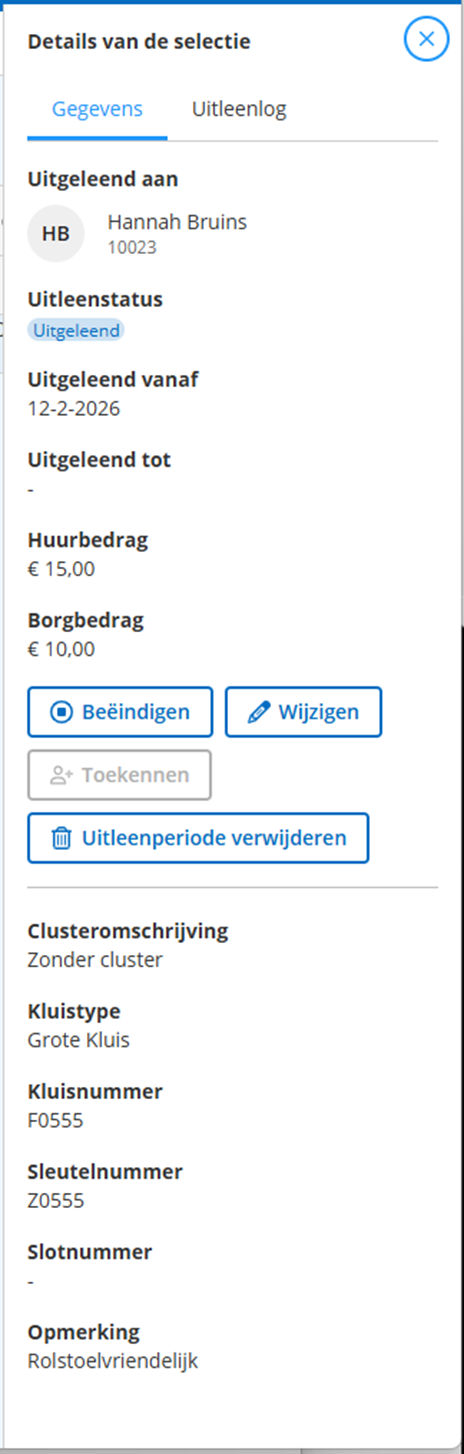 Het wijzigen of beëindigen van de uitleenperiode van een individueel kluisje kan ook via het zijpaneel dat verschijnt door op een uitgeleend kluisje te klikken: