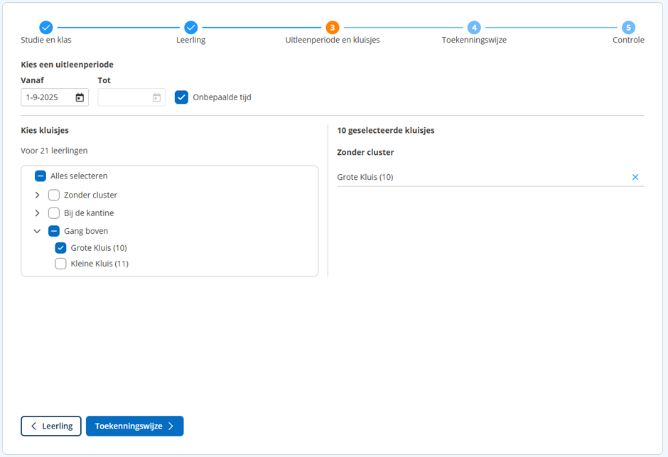 Klik onderin op ‘Uitleenperiode en kluisjes’ om verder te gaan.