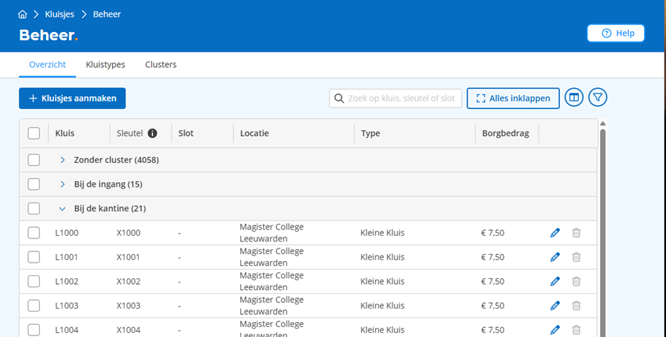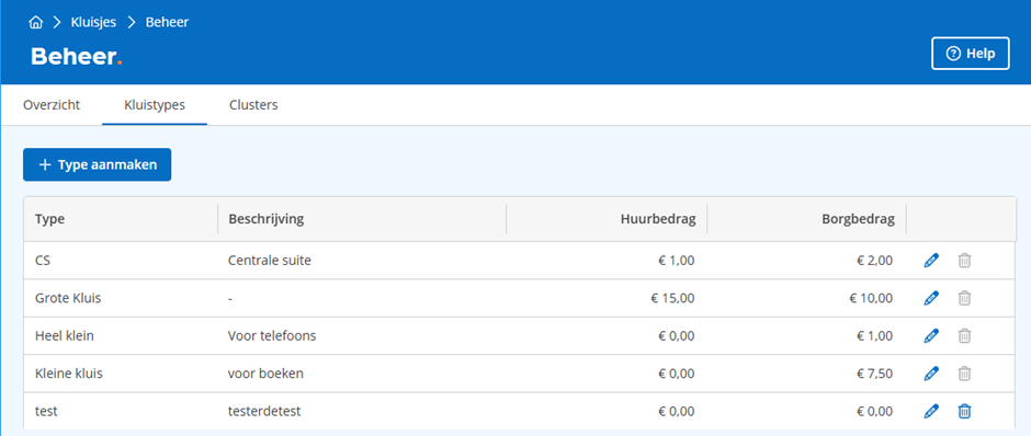 In het beheergedeelte kunnen de kluisjes aangemaakt, gewijzigd en verwijderd worden.