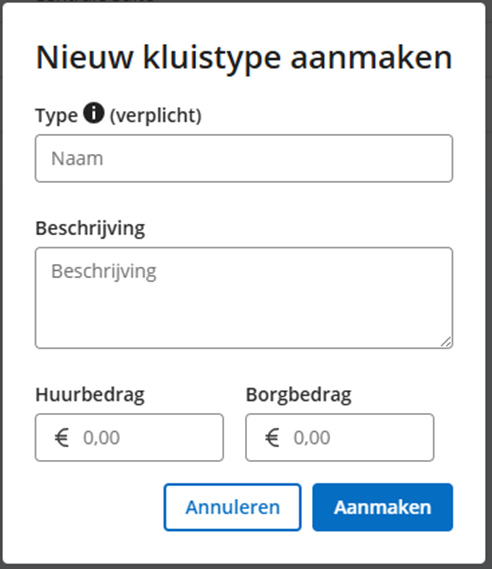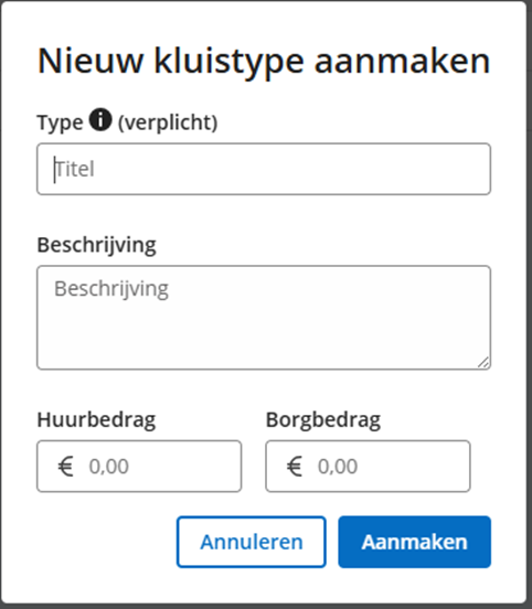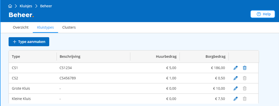 Op het tabblad 'Kluistypes' kunnen nieuwe kluistypes worden aangemaakt en bestaande types gewijzigd of verwijderd worden.