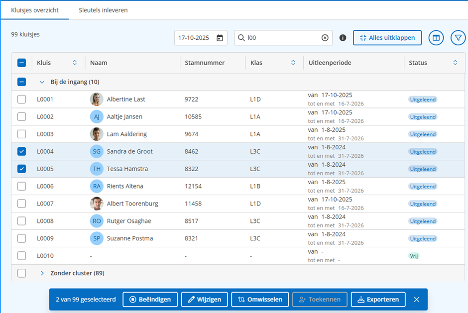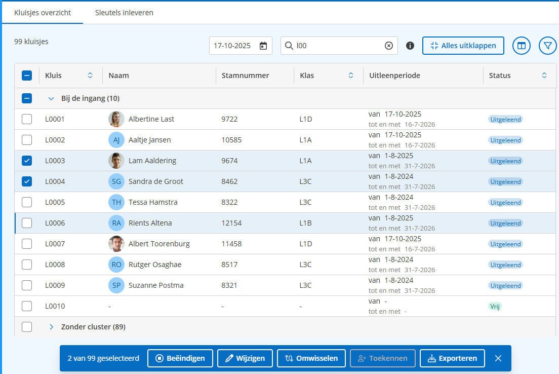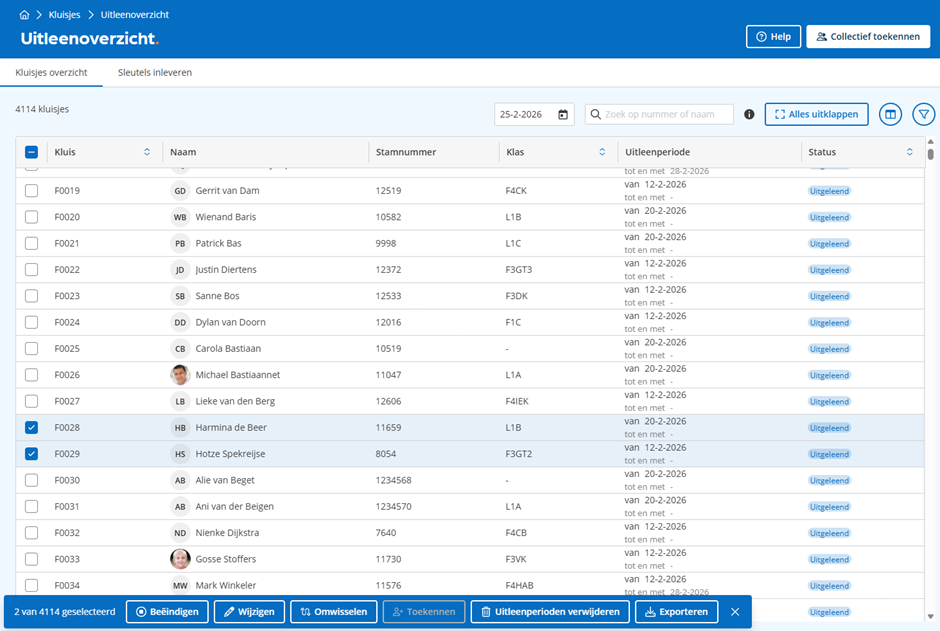 - Selecteer in het uitleenoverzicht de kluisjes die omgewisseld moeten worden.