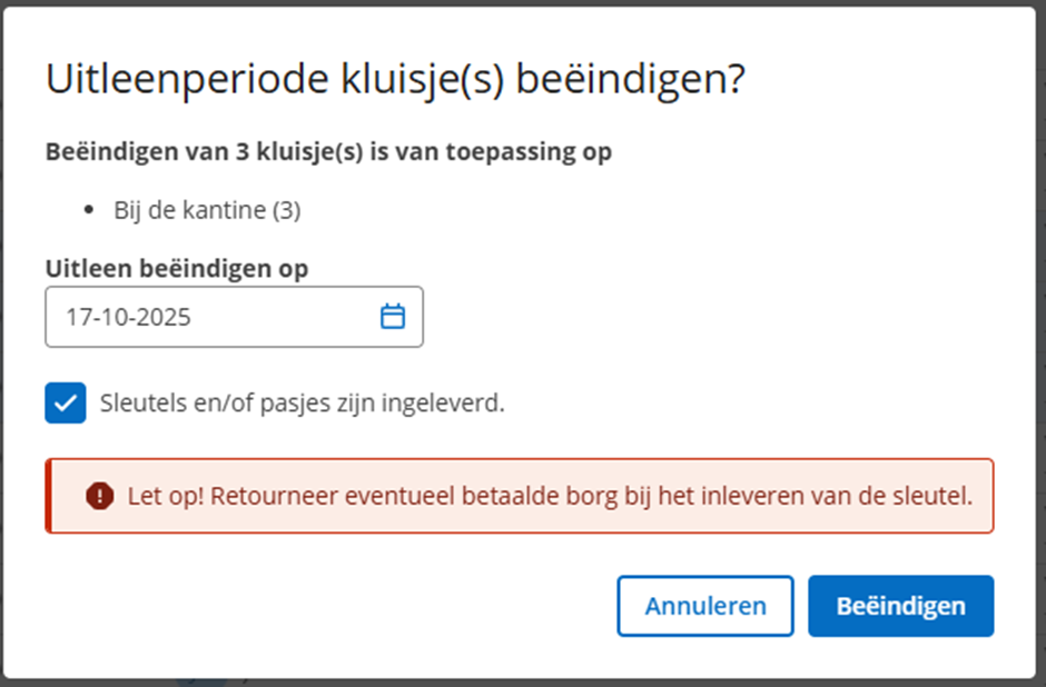 Geef aan per welke datum de uitleenperiode beëindigd moet worden en of de sleutels ingeleverd zijn.