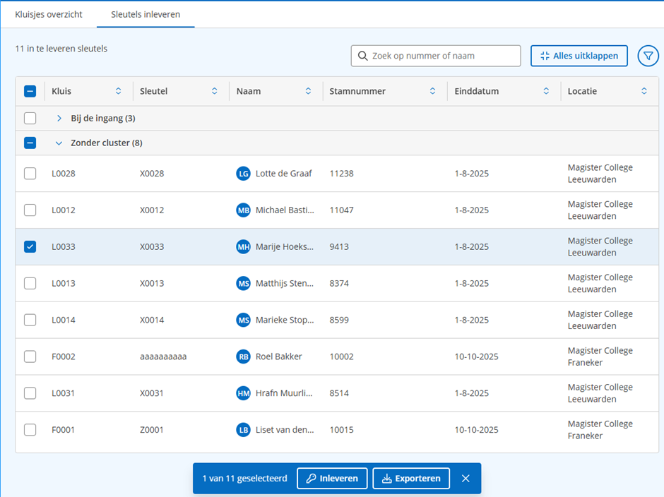 - Open het tabblad ‘Sleutels inleveren’. Dit tabblad toont alle leerlingen met een huidige verlopen einddatum van de uitleenperiode.