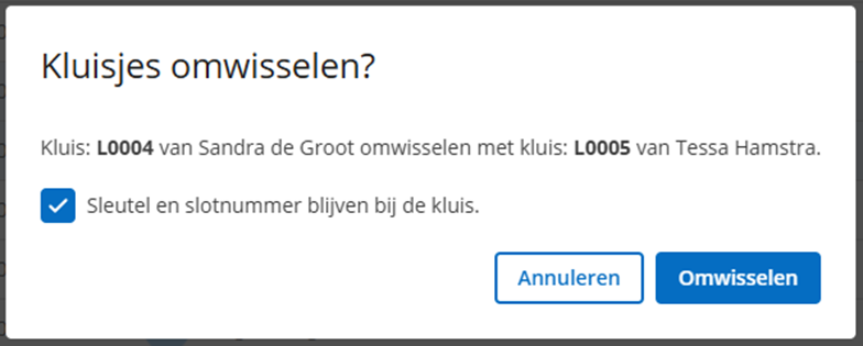 Als de indicatie ‘Sleutel en slotnummer blijven bij de kluis’ uitgevinkt is, leent gebruiker A vanaf vandaag kluisje B met sleutel A en slot A. Dit wordt ook aangepast bij de kluiseigenschappen. Dus kluis A heeft vanaf nu sleutel B en slot B en kluis B heeft vanaf nu sleutel A en slot A. - Klik op de blauwe knop ‘Omwisselen’. De volgende bevestiging verschijnt: