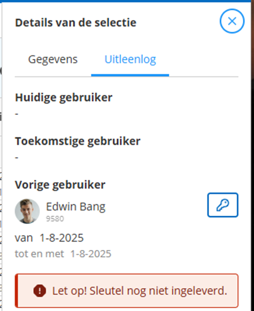Als de vorige gebruiker de sleutel nog niet heeft ingeleverd is dit ook zichtbaar in het ‘Uitleenlog’.