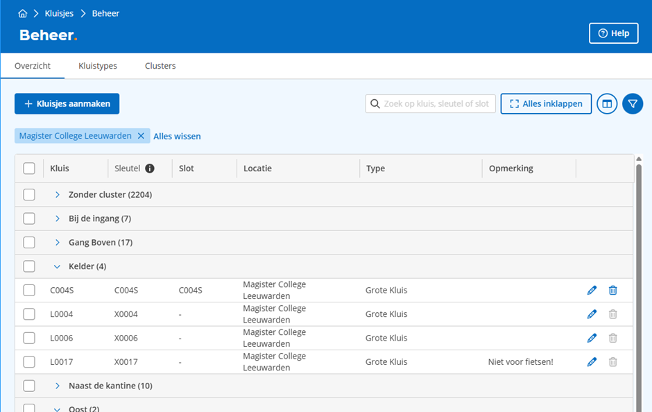 Het overzicht kan naar wens worden aangepast door gebruik te maken van de kolomkiezer en de filtermogelijkheden. Deze zijn beschikbaar via de ronde knoppen rechtsboven in het scherm. In het plaatje hierboven is bijvoorbeeld gefilterd op de locatie Magister College Leeuwarden. Bij het filteren op een locatie, worden alleen de kluisjes getoond die gekoppeld zijn aan die locatie.