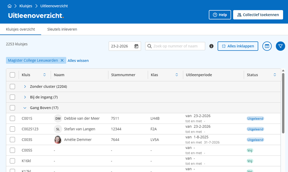 Gebruik de knop ‘Collectief toekennen’ rechtsboven in het scherm om kluisjes uit te lenen aan leerlingen.