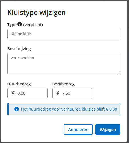 Als het huurbedrag of het borgbedrag gewijzigd wordt, geldt dit niet voor de kluisjes met dit type die op dit moment uitgeleend zijn. Het wordt alleen toegepast bij kluisjes met dit type die vanaf dit moment worden uitgeleend. - Klik op ‘Wijzigen’ om de wijzigingen op te slaan.