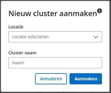 Zowel de locatie als de titel zijn verplichte velden. - Klik op 'Aanmaken' om het nieuwe cluster op te slaan.